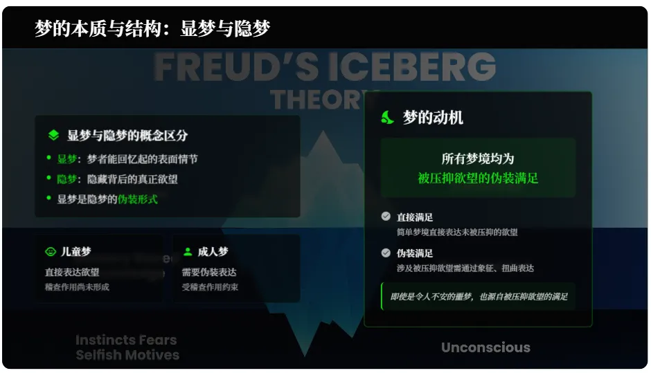 弗洛伊德将梦的内容分为显梦(梦者能够回忆起的表面情节)和隐梦(隐藏在显梦背后的真正欲望),显梦是隐梦的伪装形式。