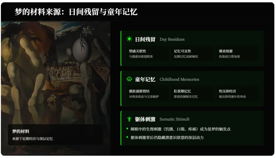 梦的材料主要来源于“日间残留”,即最近一两天内的日常经历和未处理的情绪。日间残留被选为梦的素材,是因为其与潜意识中的欲望存在隐秘联系、记忆可及性高、能规避稽查。