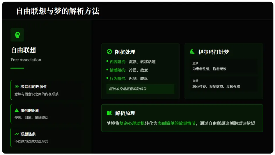 自由联想是弗洛伊德解析梦的核心技术,基于潜意识的连续性、阻抗的识别和不连续与连续联想。