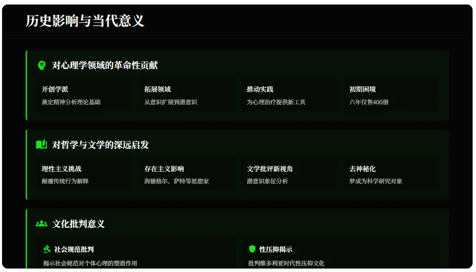 《梦的解析》开创了精神分析学派,拓展了心理学研究领域,推动了临床实践。但该书初版销量惨淡,直到20世纪初才逐渐被接受,后续也受到诸多挑战。