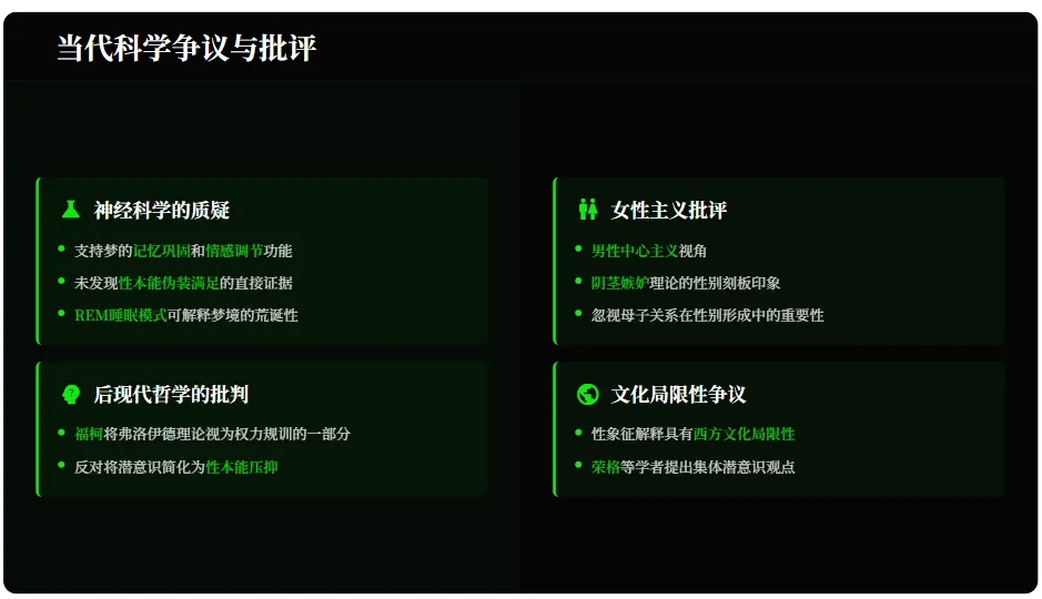 神经科学质疑其未发现直接证据表明梦是“性本能伪装满足”;后现代哲学批判其“专家模式”服务于现代知识-权力体系;女性主义批评其性别理论为男性中心主义;文化局限性争议认为其性象征解释具有西方文化局限性。