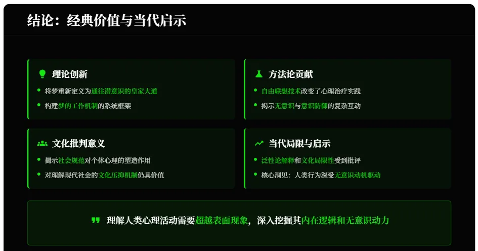 《梦的解析》理论创新在于将梦重新定义为“通往潜意识的皇家大道”,构建了“梦的工作”机制框架;方法论贡献在于自由联想技术改变了心理治疗实践;文化批判意义在于揭示了社会规范对个体心理的塑造作用。尽管存在泛性论解释和文化局限性等当代局限,但它的核心洞见——人类行为深受无意识动机驱动——仍是对现代心理学和哲学的重要启示。在当代,梦的解析已扩展为更广泛的无意识研究,弗洛伊德对潜意识的探索仍为理解人类行为的复杂性提供了独特视角。