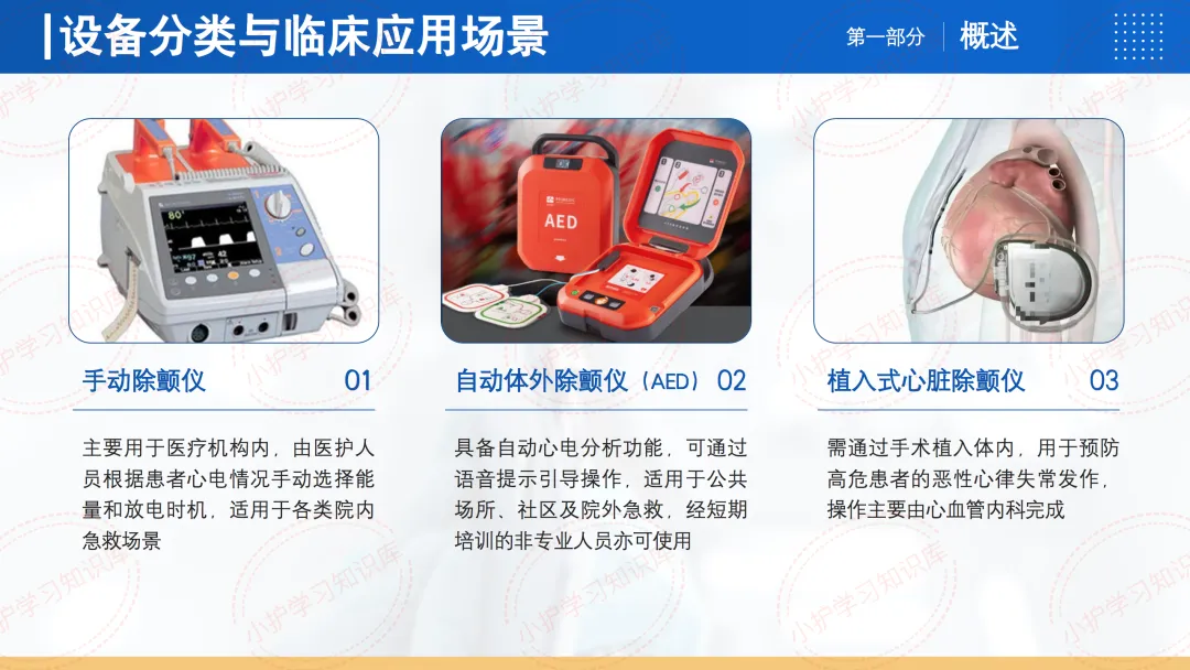 在设备分类与临床应用方面,除颤仪主要分为三类:
