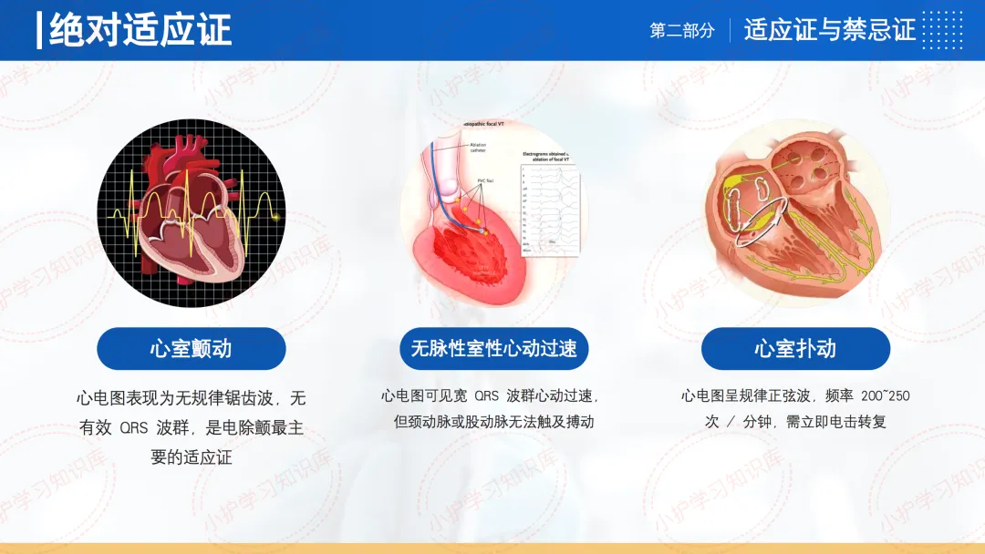 绝对适应证包括心室颤动、无脉性室性心动过速和心室扑动。