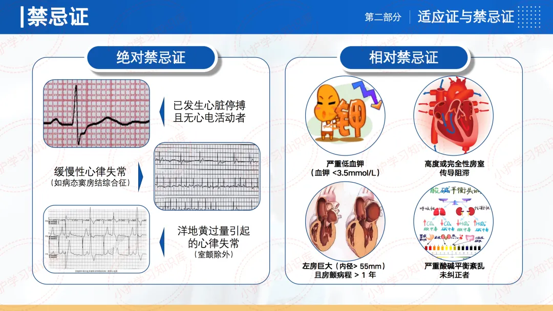 禁忌证方面,绝对禁忌证包括缓慢性心律失常、已发生心脏停搏且无心电活动者、洋地黄过量引起的心律失常(室颤除外)。