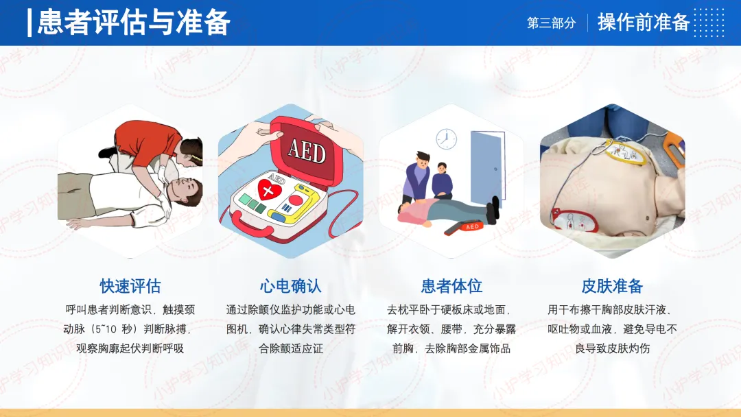 患者评估与准备方面,需快速呼叫患者判断意识,触摸颈动脉判断脉搏,观察胸廓起伏判断呼吸。