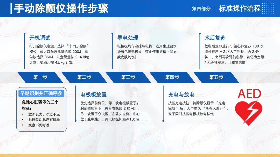 标准操作流程分为手动除颤仪和自动体外除颤仪(AED)两种。