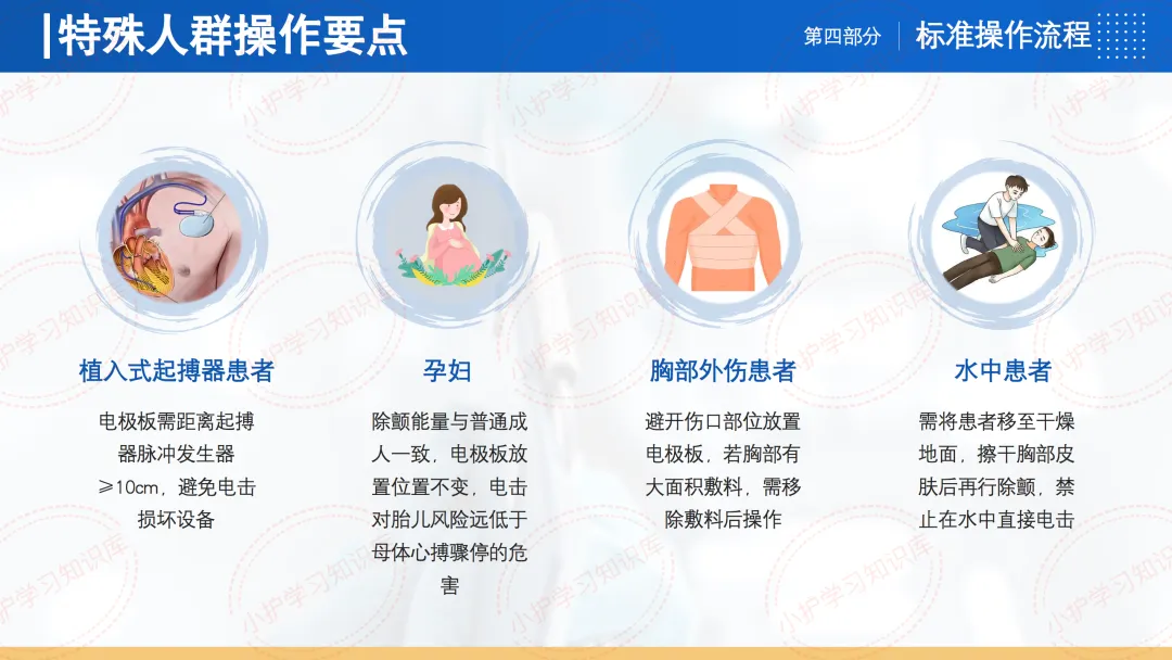 针对特殊人群操作要点,植入式起搏器患者电极板需距离起搏器脉冲发生器≥10cm,避免电击损坏设备。