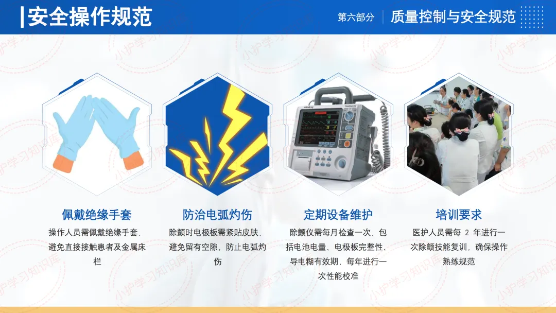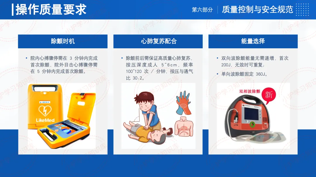 在质量控制与安全规范方面,除颤时机要求院内心搏骤停需在3分钟内完成首次除颤,院外目击心搏骤停需在5分钟内完成首次除颤。