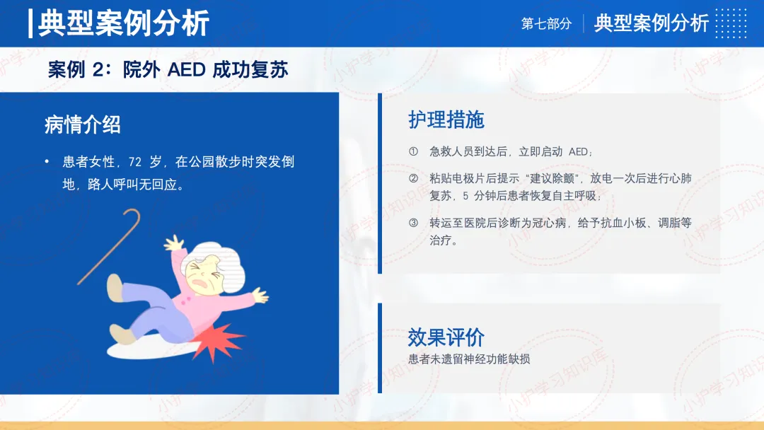 案例2为院外AED成功复苏,患者突发倒地,急救人员到达后立即启动AED,粘贴电极片后提示“建议除颤”,放电一次后进行心肺复苏,5分钟后患者恢复自主呼吸。