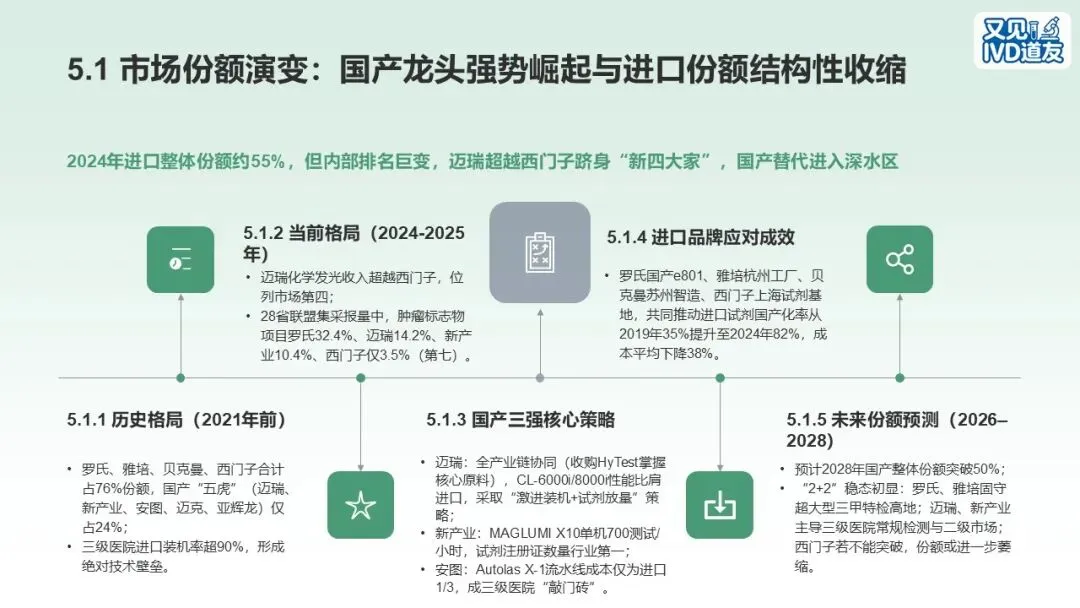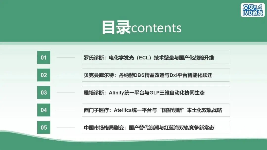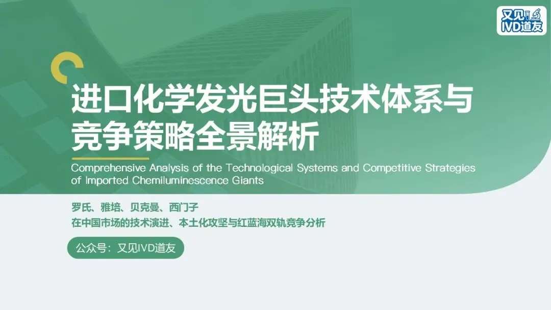 周末抽空做了一份关于进口四大家化学发光技术体系和产品竞争策略的PPT,比较简单,内容包括罗氏、雅培、贝克曼、西门子的化学发光原理、发展阶段、产品特色和竞争布局。希望对道友有所帮助!