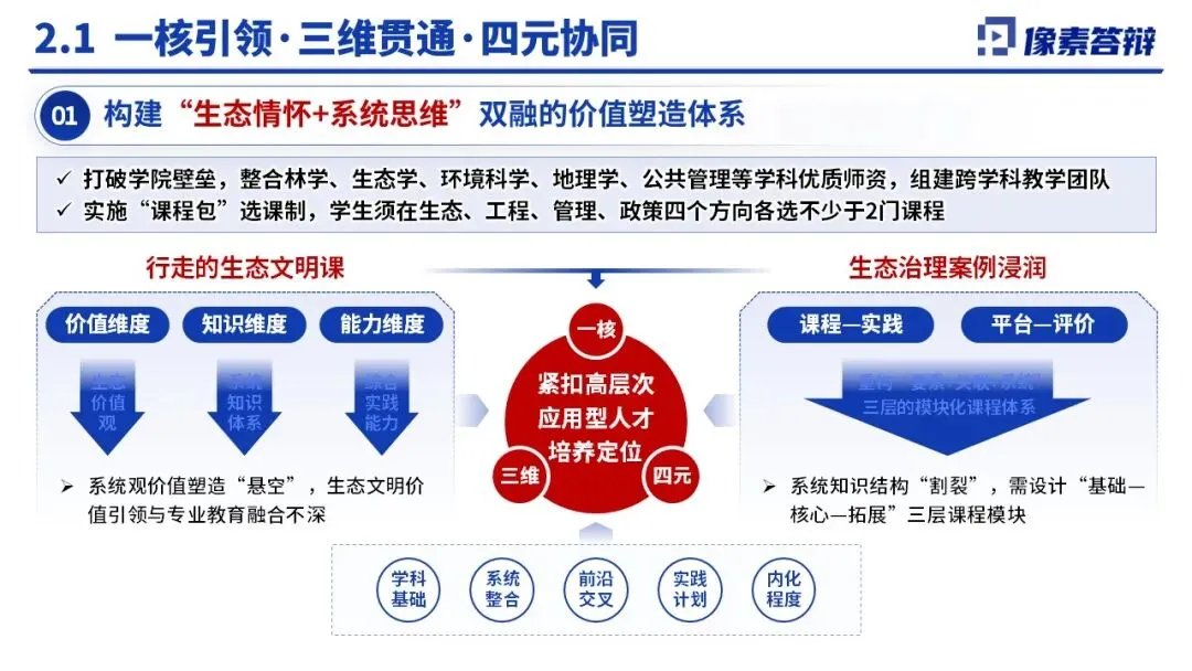育人体系重构:以 “山水林田湖草系统观” 为一核,打造价值、知识、能力三维贯通,课程、实践、平台、评价四元协同体系。