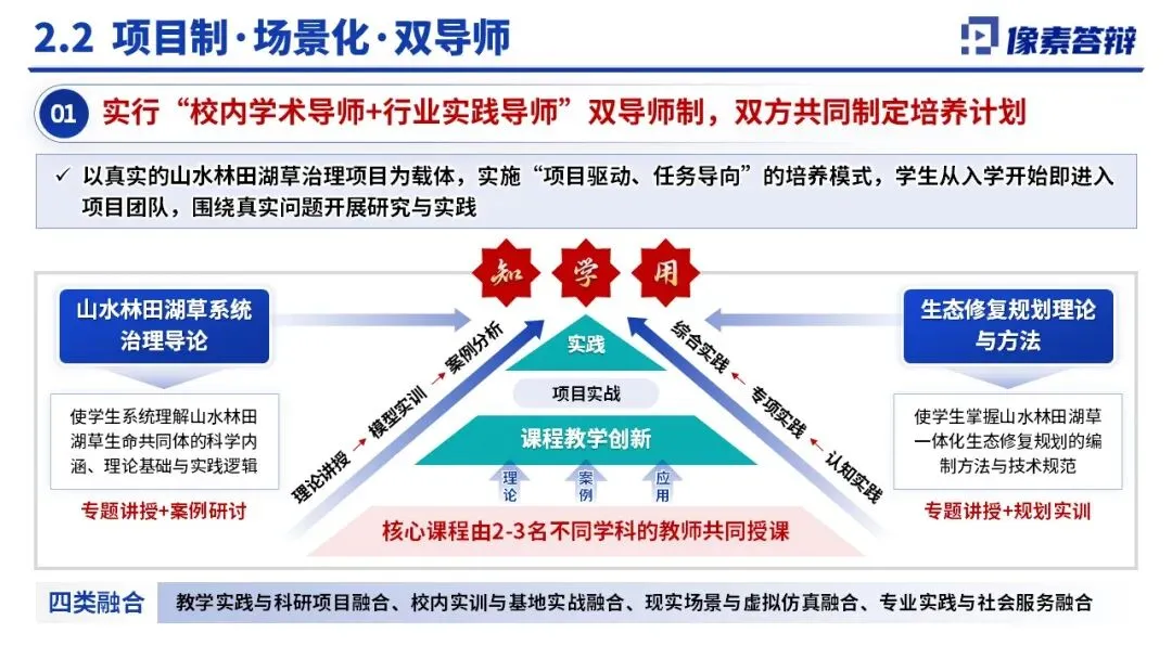 实践与导师创新:推行 “校内导师 + 行业导师” 双导师制,以真实生态治理项目为载体,采用项目驱动、场景化实战培养,实现四类融合实践。