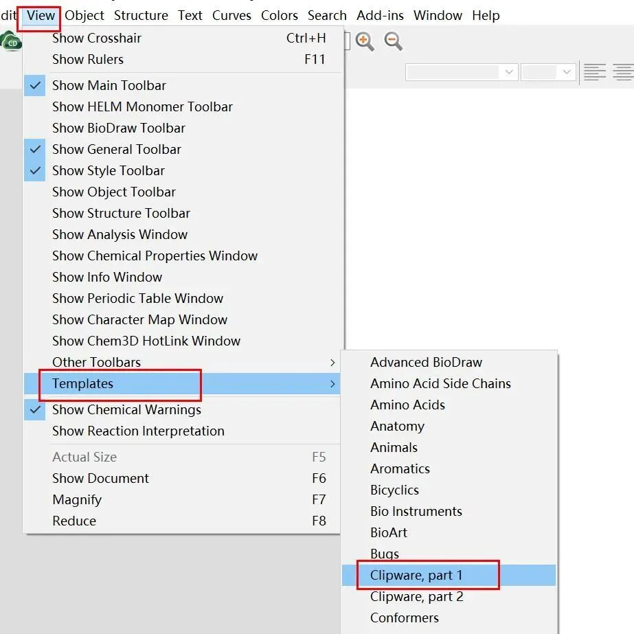 打开ChemDraw,点击View-Templates-part1/part2等,找到需要的图像。图源:截图