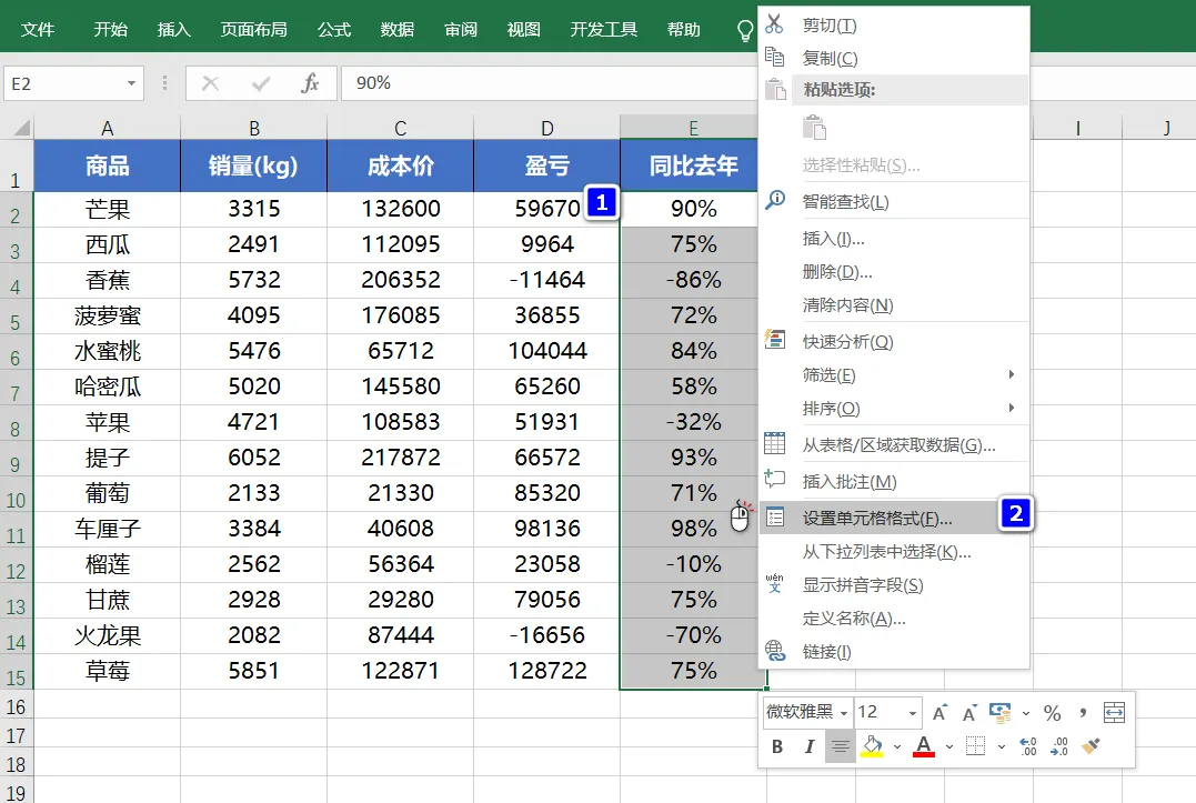先来看案例1,给E列数据增加升降箭头的标识,并且给正数百分比数据标注蓝色,负数标注红色。我们首先选中E2:E15单元格区域,鼠标右键,设置单元格格式。(Ctrl+1也可以快速打开设置单元格格式的窗口)