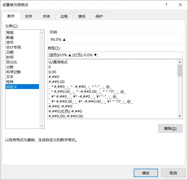 打开设置单元格格式对话框后,我们在自定义的类型中输入代码“[蓝色]0.0% ▲;[红色]-0.0% ▼;”