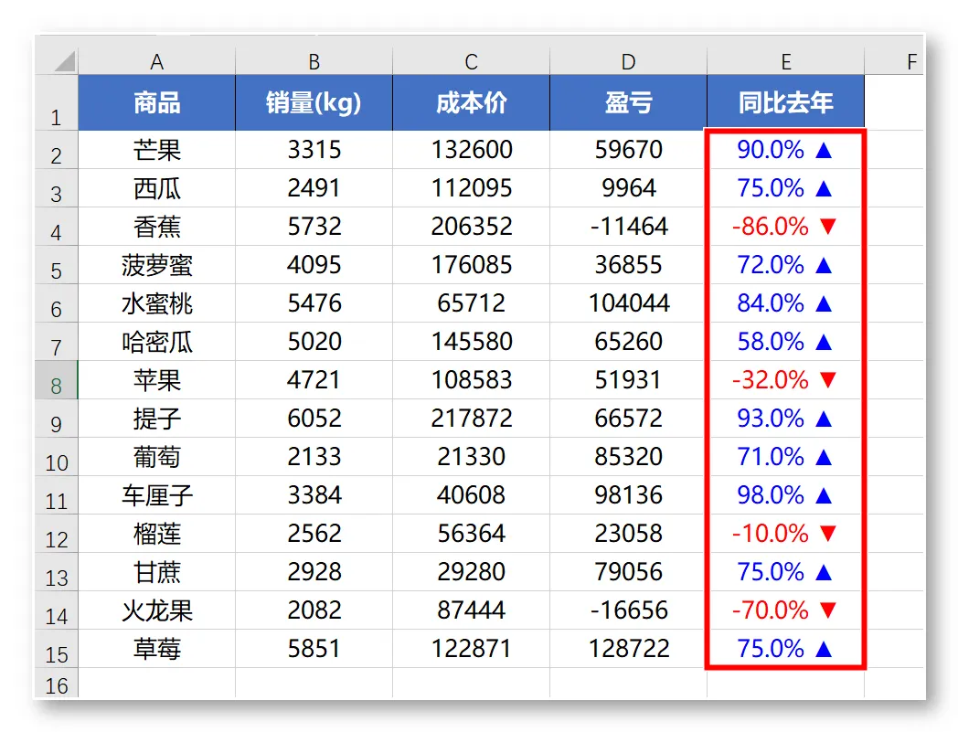 确定后回到表格数据就会显示如下图效果,此时的E2:E15单元格数据已经增加了升降箭头并且按照正负数标注了颜色。