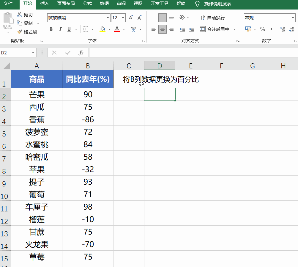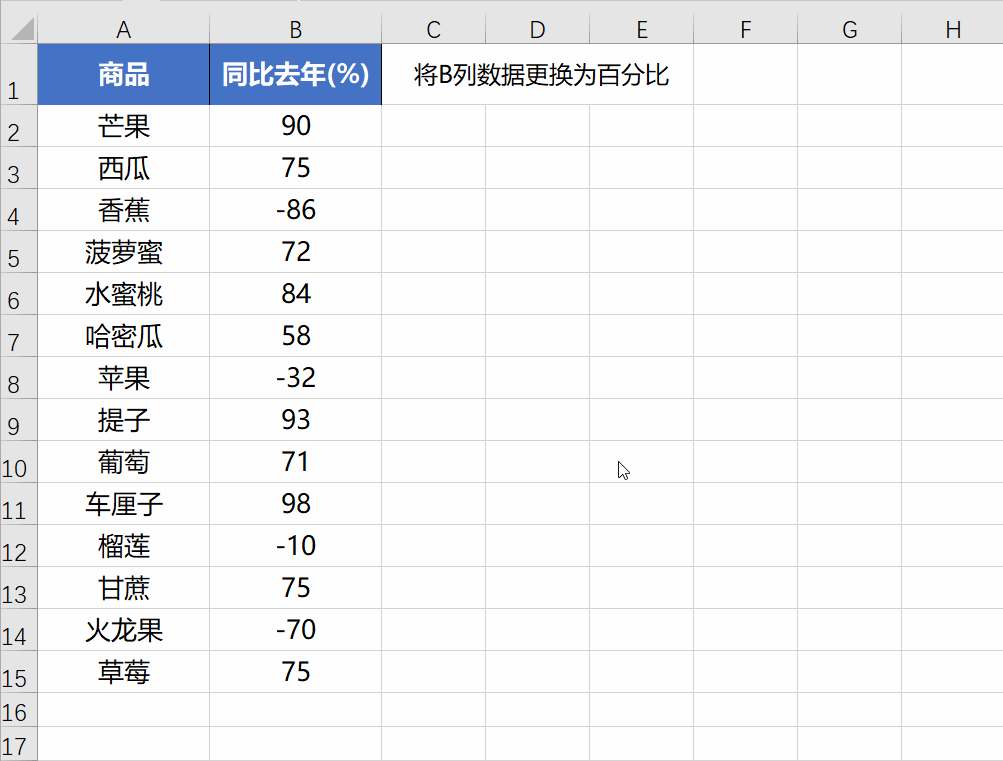 接着我们来说一下如何使用自定义单元格格式的方法快速将B列的数据转换为百分比,首先选中B2:B15单元格区域,按快捷键Ctrl+1打开设置单元格格式对话框,在自定义类型中输入代码“0\%”确定即可。