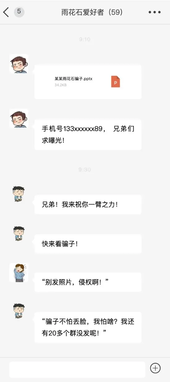 刘丽(化名)是雨花石圈的“带货达人”,平时在微信群卖石头、做拍卖。2024年3月,群友王鹏(化名)通过刘丽的好友张强(化名)买了颗雨花石,由刘丽负责邮寄。