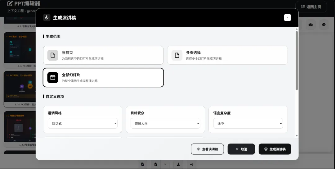 - 演讲稿生成:为每页幻灯片智能生成配套演讲稿,并支持多种格式导出。