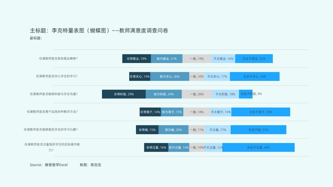 这时候,如果你对图表的知识掌握得足够多,又或者是拥有了我的图表秘笈(图表模板)之后,那么,也可以快速的绘制出类似这样子的图表李克特量表图(蝴蝶图)。整体效果,就比柱形图,要高了几个level了哟。