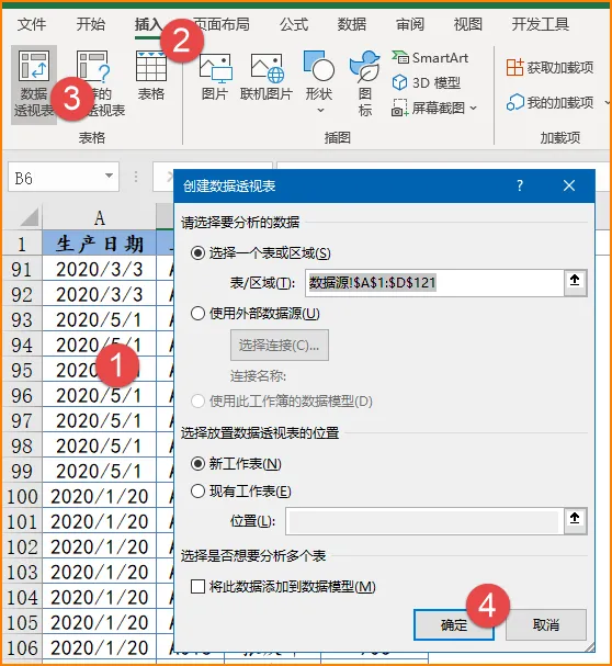在弹出的对话框中,确认数据源区域是否正确,选择将数据透视表放置在“新工作表”或“现有工作表”的指定位置,点击“确定”。