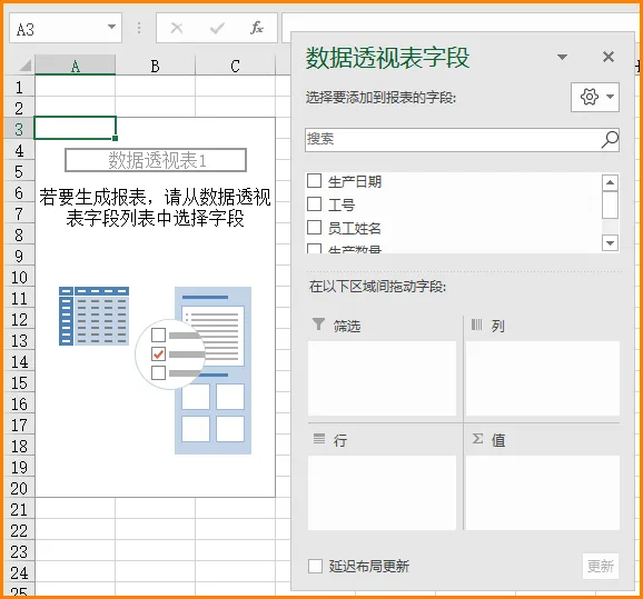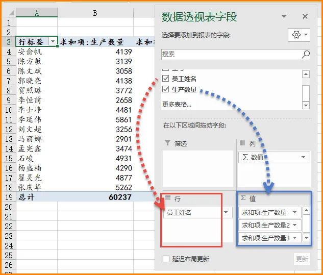 效果:报表区域会自动显示员工姓名列表,以及3列“求和项:生产数量”(默认汇总方式为求和),后续只需修改汇总方式即可。