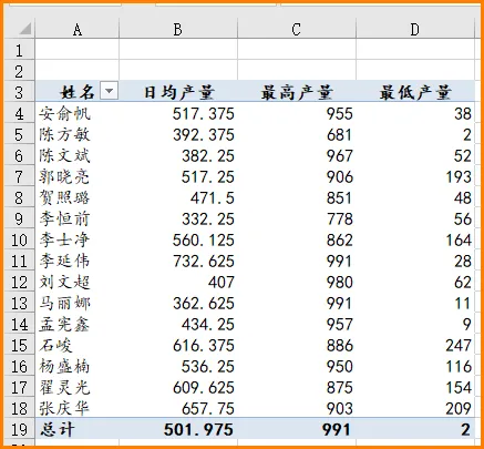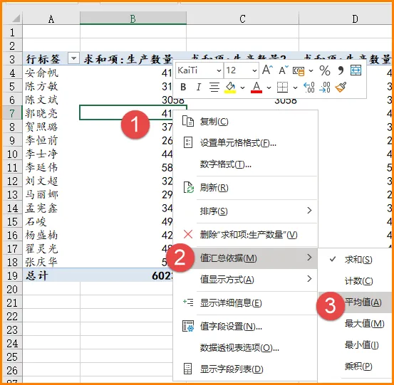 效果:该列会自动变为“平均值项:生产数量”,显示每名员工的日均产量(如安俞帆日均产量517.375)。
