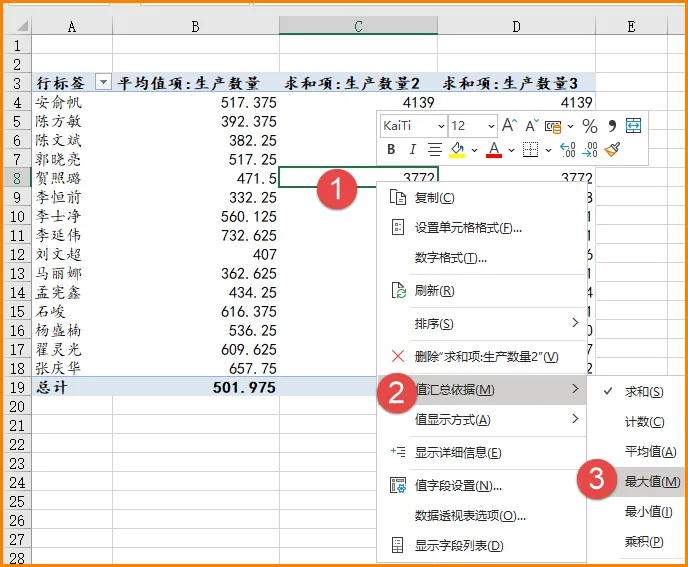效果:该列变为“最大值项:生产数量2”,显示每名员工的最高日产量(如安俞帆最高产量955)。