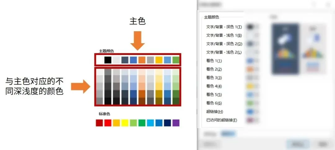 主题颜色是一个系列,包含十个颜色,笔者习惯将这十个颜色称为主色,调色板中会列出每个主色五个不同深浅度的颜色。使用调色板中的颜色可以通过更换主题实现一键换色,主色可以选择软件自带的搭配,也可以自定义设置。
