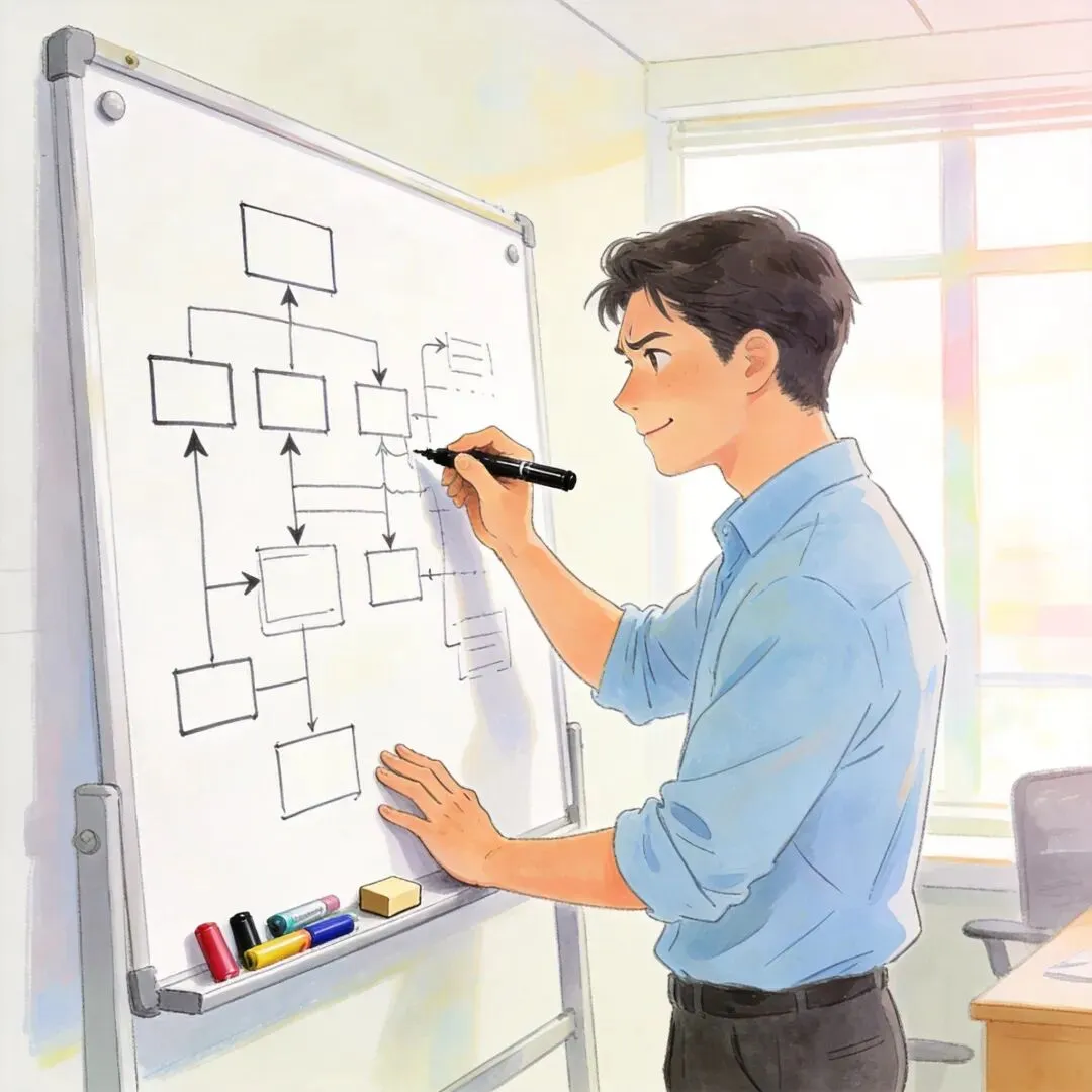 头脑风暴时,团队在白板上画出精彩的产品架构和流程图。