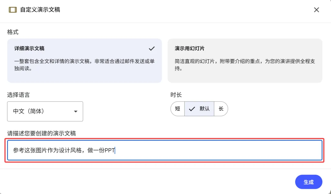 第二步:输入一句简单的命令,并点击“生成”。