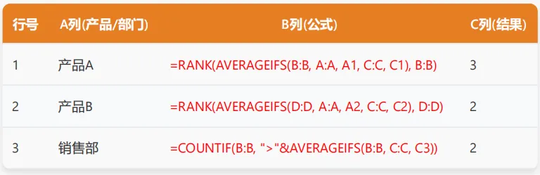 - 功能:使用AVERAGEIFS进行多条件平均值计算,然后使用RANK进行排名,或使用COUNTIF进行计数