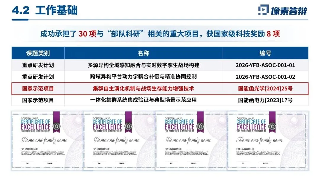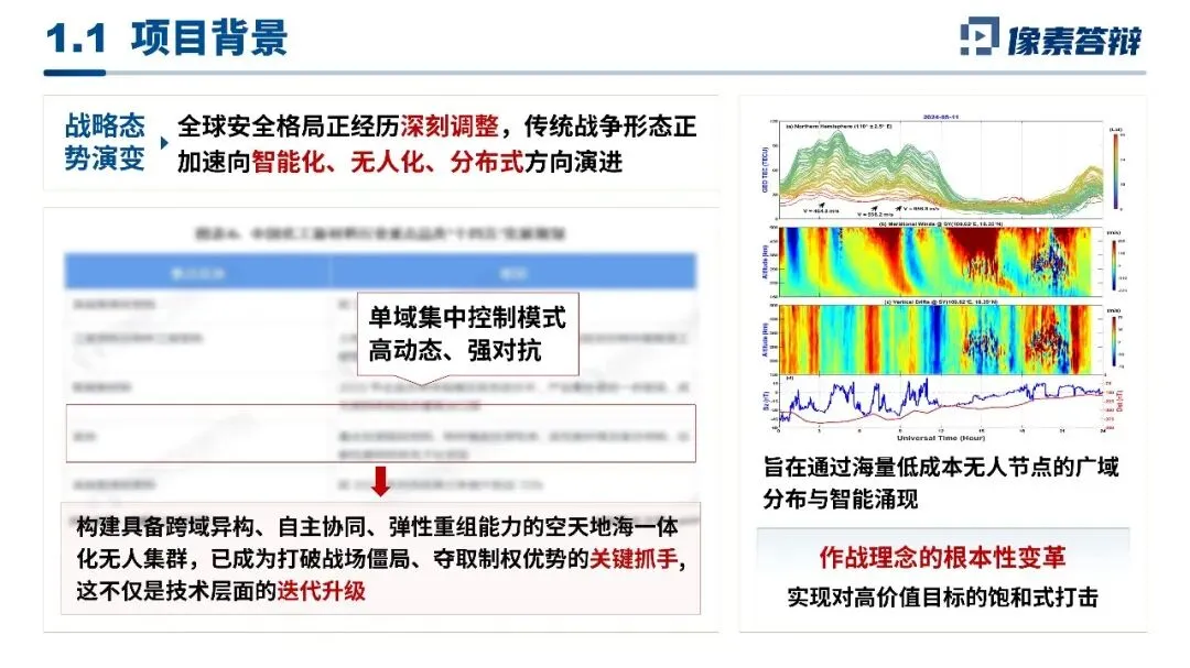 开篇定调精准贴合国家战略需求,采用「左右图文分栏」排版,锚定全球安全格局演变的核心背景,左栏讲空天地海一体化无人集群的战略刚需,右栏用实测数据图拆解作战理念变革,精准点出单域集中控制模式的行业痛点,开篇就立住项目战略高度与立项必要性。