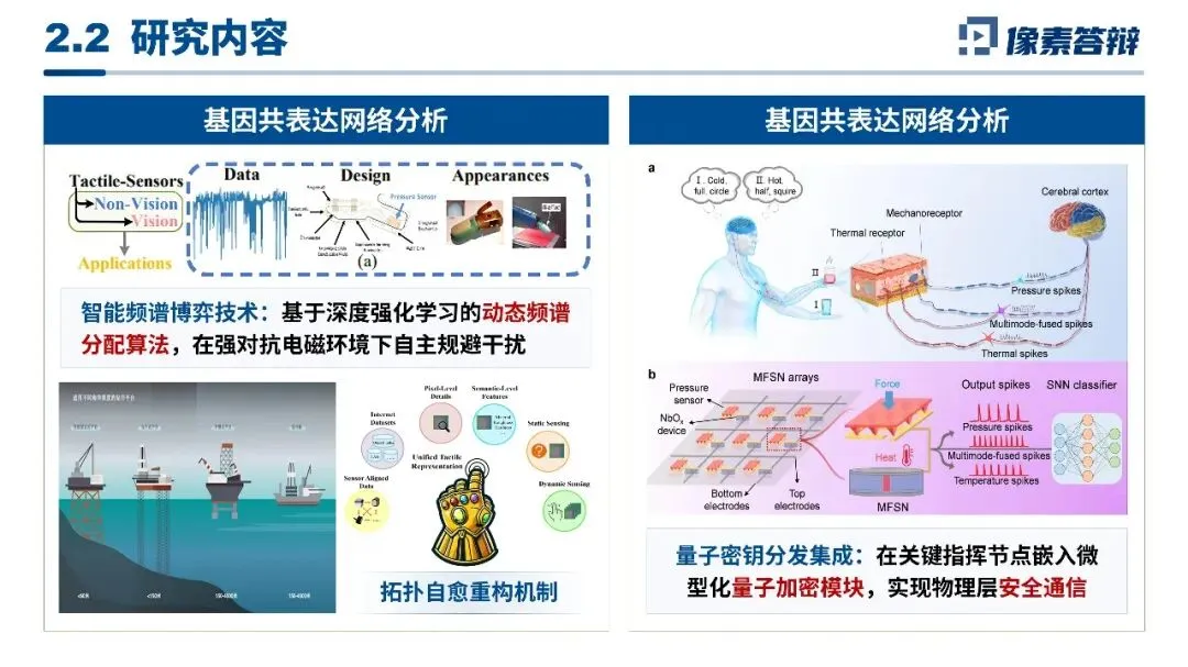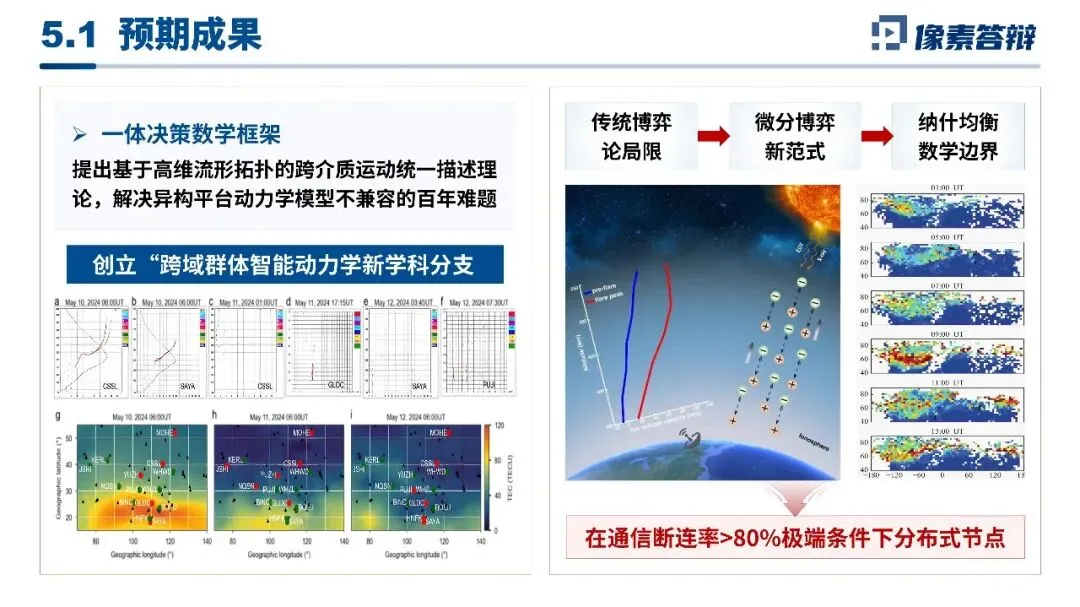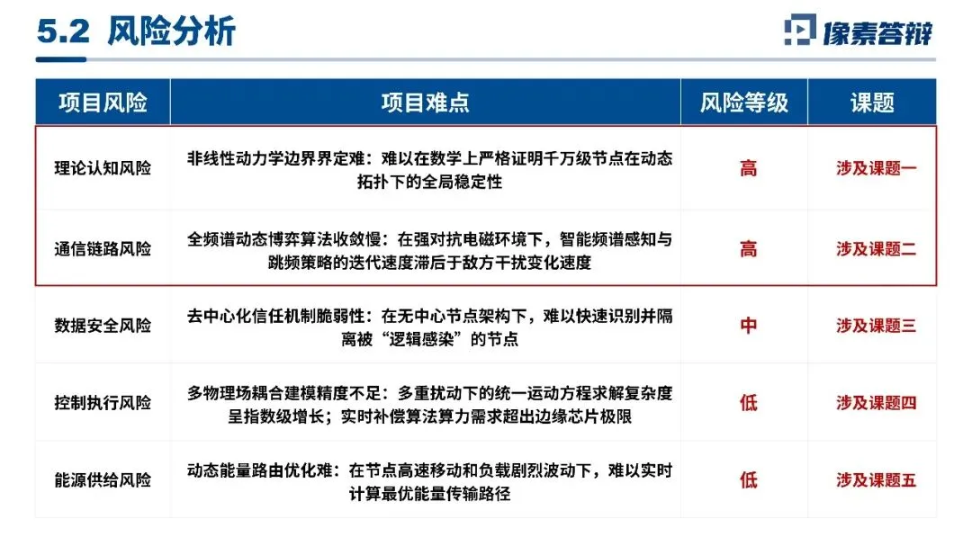 内容逻辑采用闭环式叙事,严格遵循国防科研范式,以五大课题双向联动的递进结构梳理研究全链条,坚持单页单主题,从多维感知、通信组网,到博弈决策、协同控制、仿真验证,逻辑环环相扣,评审一眼读懂核心脉络。
