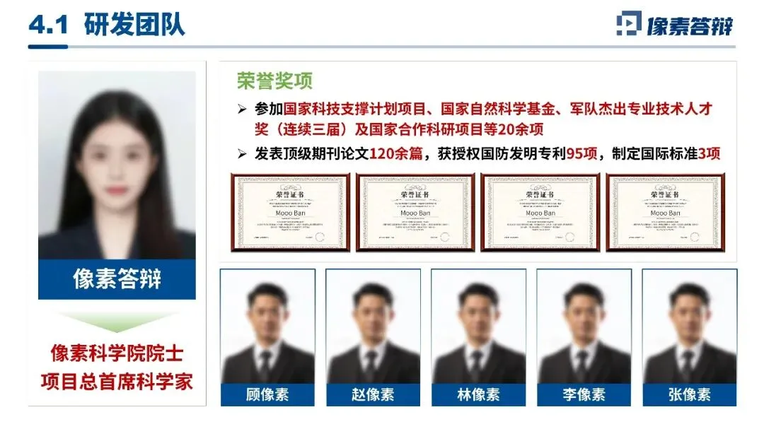 技术呈现用可视化拆解降门槛,以架构图、机理示意图、算法流程图替代大段公式,全链条技术路径可视化呈现;团队与基础页用院士领衔的研发阵容、国家级项目资质做硬核背书。收尾从理论突破到实战应用全维度呈现,完美回应重点研发计划评审要求,适配国防预研、科技奖全申报场景。