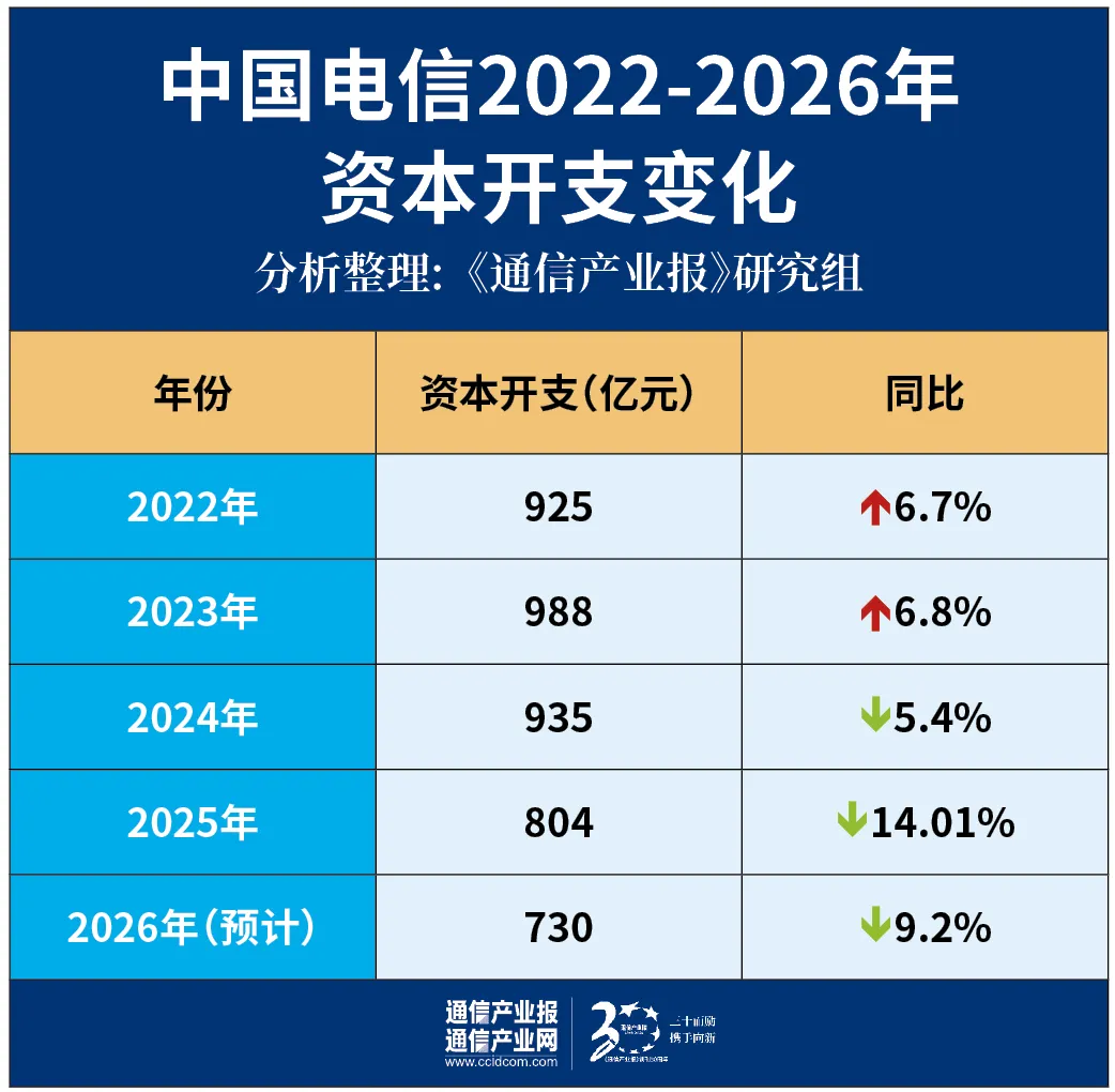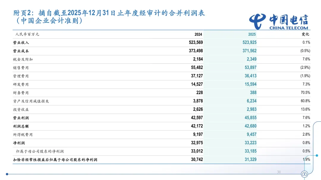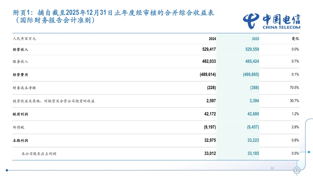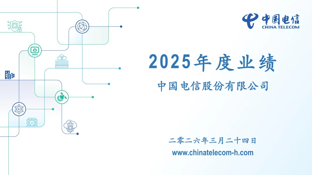 2025年3月24日,中国电信发布2025年业绩。2025年,中国电信经营收入为5296亿元,其中服务收入为4854亿元,同比增长0.7%。EBITDA为1439亿元,同比增长2.1%。净利润为332亿元,同比增长0.5%,每股基本净利润为0.36元。资本开支为804亿元。自由现金流为447亿元。