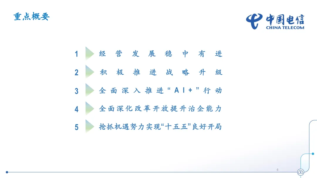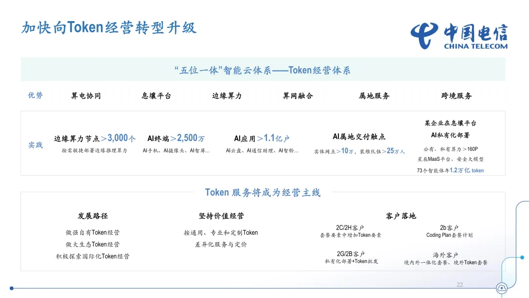 中国电信深刻认识到人工智能带来的颠覆性变革,抢抓机遇,乘势而上,推进企业战略升级,构建完成并持续深化“五位一体”智能云体系,深入推进“人工智能+”行动,全力打造“三型”企业。加快推进高水平科技自立自强,集中力量攻关“息壤”第一科技,聚焦四大根技术,持续加大关键核心技术攻关,研发费用达到156亿元,同比增长7.3%,科技创新成效显著。公司以第一科技“息壤”为核心,发挥云网融合优势,加快核心技术攻关,构建完成并持续深化“算力、平台、数据、模型、应用”一体化的智能云体系。在IaaS层,实现从基础算力底座向AI原生算力底座全面升级,依托“通智超量”一体弹性计算、AI统一数据存储及AI高性能云网络,实现云智一体的算存网协同效能大幅提升,形成高并发、高吞吐、高算效的AItoken规模化生产能力。在PaaS层,打造Triless平台架构,实现资源、框架、工具三重解耦,截至目前自有及接入智算总规模达到91EFLOPS,突破多级缓存、异构计算、模型路由优化等技术,为各类大模型提供工具服务。在DaaS层,打造高质量数据集和可信流通工具链,推进自有、开源和第三方数据集深度融合,汇聚超10万亿token的通用大模型语料数据和覆盖超14个行业的高质量数据集,总量超500TB。在MaaS层,持续强化央企首个“全模态、全尺寸、全国产”的星辰大模型体系,在语义、语音、视觉与多模态等领域形成行业领先优势。在SaaS层,打造标准化AI产品体系,推出适配多场景需求的行业大模型与智能体服务,让AI更加灵活触达、便捷可用,持续赋能经济社会数智化转型发展。公司全面深入推进“AI+”行动。持续将AI融入自身生产经营的核心环节,构建包含智能客服、智能营销、智能运营、智能研发、智能管理五大领域的AI应用场景图谱,累计上线应用超250个,用AI变革企业工作流程,全面提升运营效率。打造超110个行业大模型和超350个行业智能体,形成覆盖工业、政务等15类行业AI应用标准范式,服务超3.7万家行业客户,打造国资央企“AI+”行动示范基地,牵头建设国资央企领域可信数据空间和算力池,央企AI渗透率达85%。深耕量子通信、量子计算与量子精密测量领域,加快全栈式量子产品落地,量子通信用户规模突破680万户,服务政务、金融、能源等领域行业客户超5.000家;实现量子计算真机部署、云平台应用、量子信息教育三大应用场景产品化,为高校提供量子算力与学科教研支持;加速量子精密测量技术从“工程化”到“市场化”进程,在地质勘探等典型场景中部署应用。前瞻布局低空经济新赛道,打造全新升级的AI+“1+1+4+N”低空经济能力体系,形成千余个应用场景,面向低空基础设施、运行监管、安全防护和智能作业等场景提供一站式解决方案,产品已在160余座城市落地,全面提升低空运行的数字化、智能化和安全化水平,助力低空经济“飞得安全、飞得高效”。公司始终将安全发展贯穿企业生产经营各环节,不断健全制度体系,扎实提升治理能力,着力打造技术底座,持续优化服务保障,筑牢网络和信息安全防线。高度重视AI安全治理,围绕环境、数据、模型、内容、应用持续完善AI安全治理框架,发布业内首部《AI智能体安全治理白皮书》,持续升级全方位人工智能动态防护体系。打造卓越安全产品、一流安全服务和行业级安全集成能力,为客户提供更加丰富可靠的安全保障,构建以云堤抗D、云脉零信任、安全大脑、云镜主机安全等为核心的产品矩阵,加快安全融智。推出国内首款运营商级智能体安全解决方案一天翼智安,以全流程管控、实时防御、行为溯源能力助力用户构建OpenClaw类智能体安全解决方案。公司深化“网是基础、云为核心、网随云动、云网一体、智惠共生”的发展理念,加快推进适应AI时代的数字信息基础设施升级,锚定全国一体化算力网,推动算、存、运、AIDC、电一体化布局和升级。推动算力资源高效协同,自有智算能力达46EFLOPS。紧密围绕“东数西算”战略优化布局,在国家枢纽节点适度超前储备机楼、电力、能耗等资源,按照“两高两活”建设标准,打造高效、绿色、智能的算力底座,机架功率规模超3.2GW,高功率机架总功率同比增加超35%,积极开展海外AIDC布局。深化算电协同发展,推进供电架构升级,探索新型供电模式,率先打造4个全国性标杆。公司持续推进空天地一体、国际国内一体的信息通信网络基础设施演进升级。打造千兆光网10GPON端口超1,000万个,城镇千兆住宅覆盖率超97%。积极推进新一代高轨移动通信卫星及高轨高通量卫星立项建设,开放共享天通业务,启动北斗短信商用试验。构建“一轴两翼三网四中心”国际网络体系,推进昆明、海口全业务出入口局建设,主导建成近五年首条登陆中国大陆的亚洲直达(ADC)国际海缆,积极服务“一带一路”方向业务拓展。打造高中低频协同、5G/4G融合的共享网络,持续为全球贡献中国智慧和中国方案。2026年是“十五五”开局之年,我国经济基础稳、优势多、韧性强、潜能大,长期向好。新一轮科技革命和产业变革加速演进,智能化、绿色化、融合化成为我国现代化产业体系建设的发展方向,“人工智能+”全方位深化拓展,智能经济新形态加快形成,催生出广阔而蓬勃的市场空间。公司将抢抓发展战略机遇,全面实施云改数转智惠战略,持续深化“五位一体”智能云体系,以打造领先的AI服务商为目标,以token服