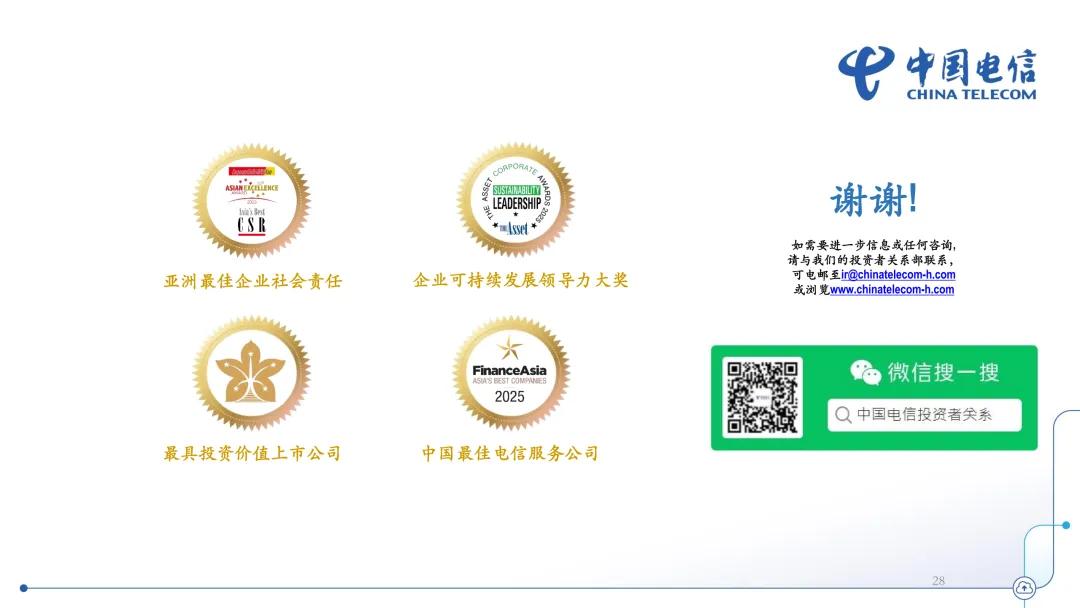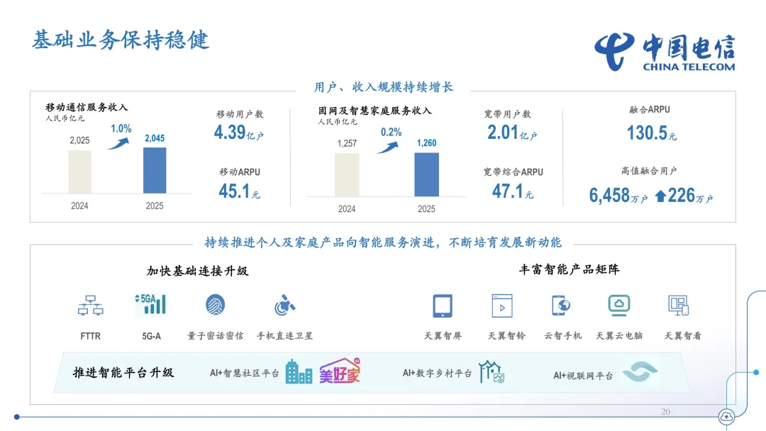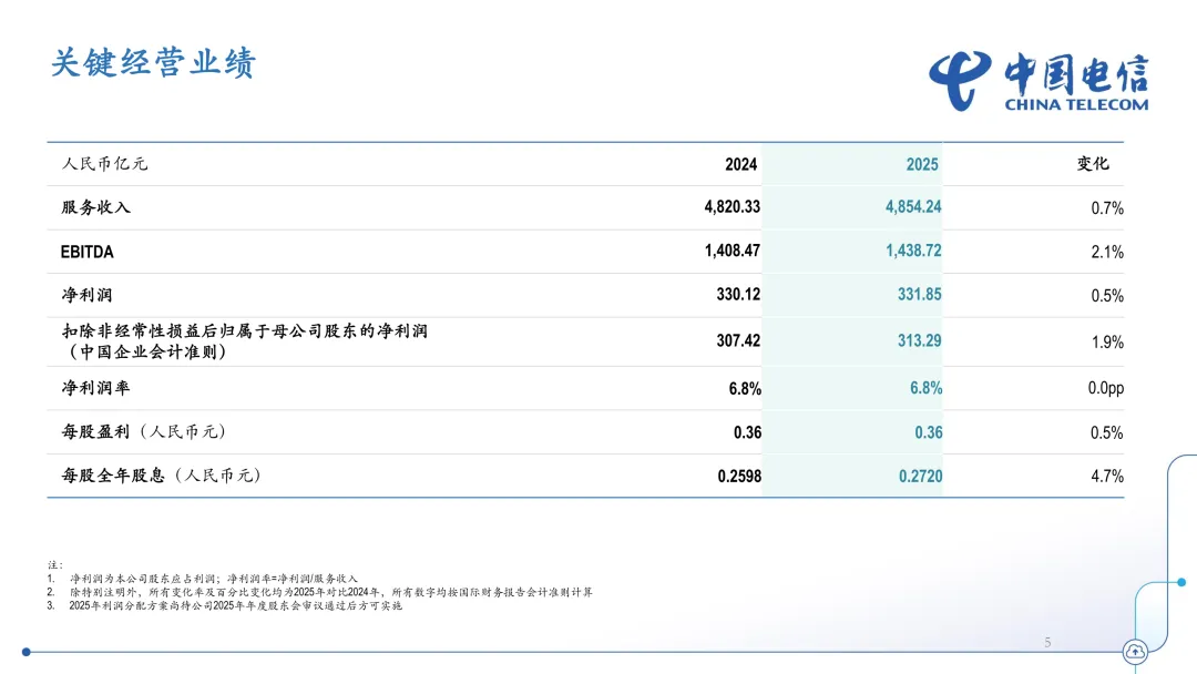 2025年,中国电信完整、准确、全面贯彻新发展理念,积极服务和融入新发展格局,坚定履行建设网络强国、科技强国、数字中国和维护网信安全的责任,准确把握科技创新和产业发展趋势,全面拥抱人工智能,推动企业战略从“云改数转”向“云改数转智惠”升级,高质量发展迈出新的坚实步伐。2025年,中国电信经营收入为5296亿元,其中服务收入为4854亿元,同比增长0.7%。中国电信持续推动创新引领的基础和产数业务双轮驱动融合发展。2025年,基础业务收入达到3,305亿元,同比增长0.7%,移动用户达到4.39亿户,5G网络用户渗透率达到68.8%,宽带用户达到2.01亿户,千兆用户渗透率达到31.6%。产业数字化业务收入达到1,473亿元,同比增长0.5%,其中资源型收入达到630亿元,同比增长1.1%。战新业务继保持较快增长,天翼云收入达到人民币1,207亿元,公有云laaS市场份额升至国内第二,laaS+PaaS市场份额居国内前三;AIDC收入达到人民币345亿元,安全收入达到人民币166亿元,智能收入达到人民币123亿元;视联网收入同比增长31.2%,量子收入同比增长65.4%,卫星收入同比增长30.7%。据介绍,中国电信在充分考虑盈利、现金流水平及未来发展资金需求后,董事会决定向年度股东会建议,公司2025年度以现金方式分配的利润为本年度本公司股东应占利润的75%,每股派发末期股息人民币0.0908元(含税),连同2025年中期已派发股息每股人民币0.1812元(含税),2025年全年派发股息为每股人民币0.2720元(含税)。2025年,中国电信净利润为332亿元,同比增长0.5%。中国电信积极把握“AI+”消费升级新趋势,持续推进发展模式创新升级,面对市场新业态、新场景,不断丰富高质量产品供给。