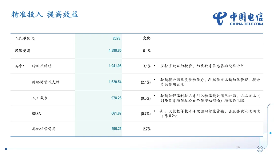 2025年营收5296亿元,同比持平;净利332亿元,同比增长0.5%。2026年以token服务为经营主线,打造领先的AI服务商。