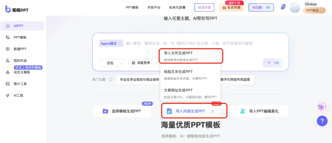 首先,打开笔格PPT,在首页找到「导入内容生成PPT」,选择「导入文件生成PPT」。