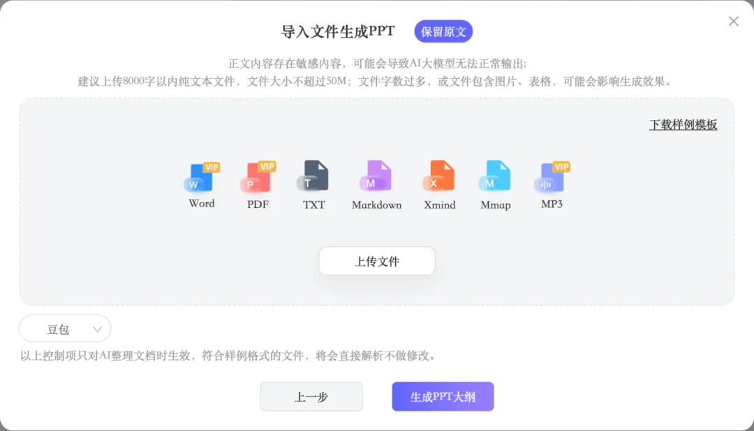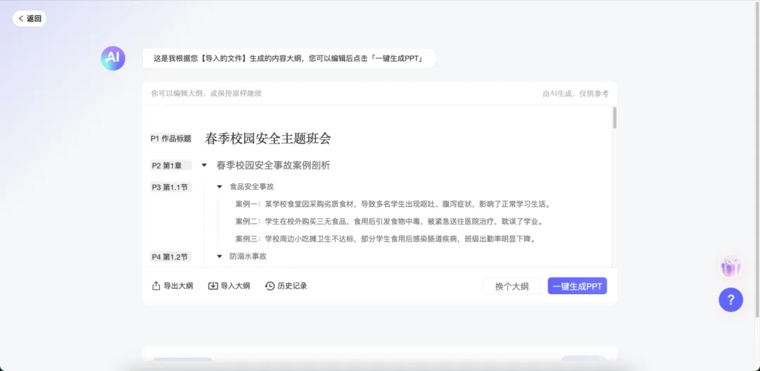 上传文档后,选择「生成PPT大纲」,AI会快速解析文档内容,一键生成清晰的大纲。
