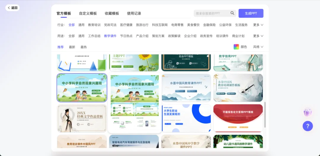 你可以根据需求选择一个合适的模板,点击右上角的「生成PPT」,进入生成页面。