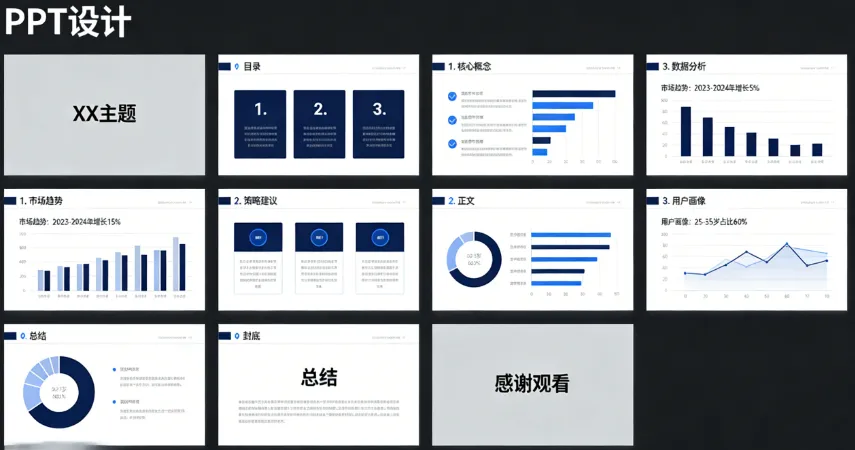 帮我制作XX主题PPT,共X页,商务简约风格,包含封面、目录、正文、总结、封底,每页要点清晰,配图表。