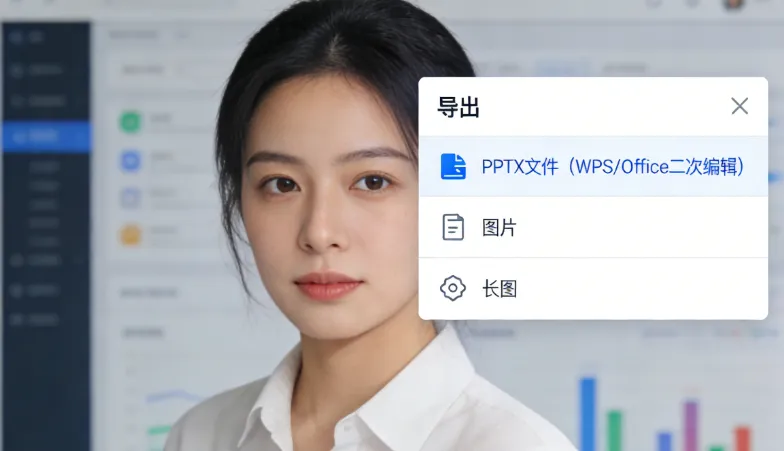 点击右上角「导出」,下载PPTX文件,用WPS/Office二次编辑,也可导出图片/长图。