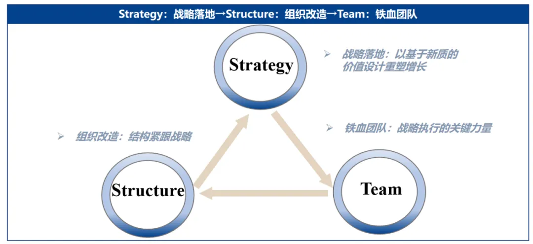 在不确定性时代,卓越的企业不再依赖单一维度的胜利,而是通过战略落地(Strategy)提供新质方向,组织改造(Structure)提供敏捷载体,铁血团队(Team)提供执行动能,构建起三者互为咬合、缺一不可的铁三角。