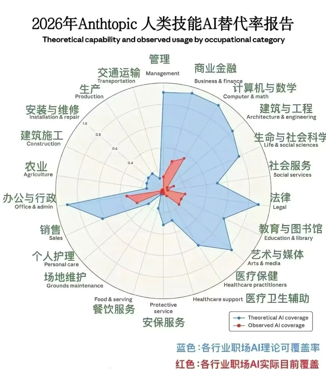 这张图来自 Anthropic 2026年人类技能AI替代率报告,是一个职业类别 vs AI能力覆盖率的雷达图。
