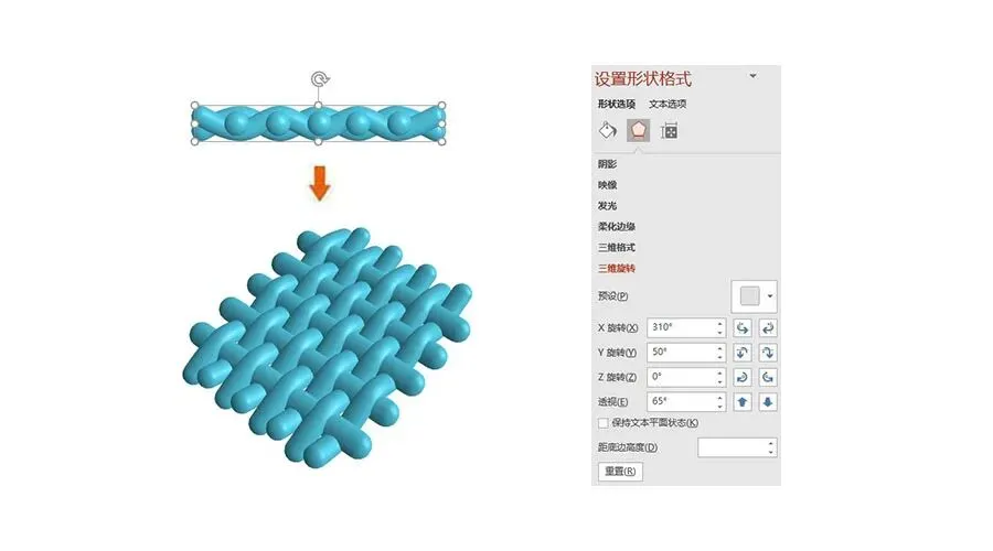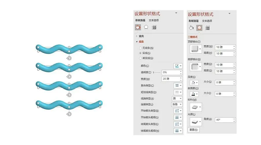 三维旋转保持默认状态,X、Y、Z 轴旋转均为 0°。将四条波浪线距底边的高度依次设为 0 磅、40 磅、80 磅和 120 磅。
