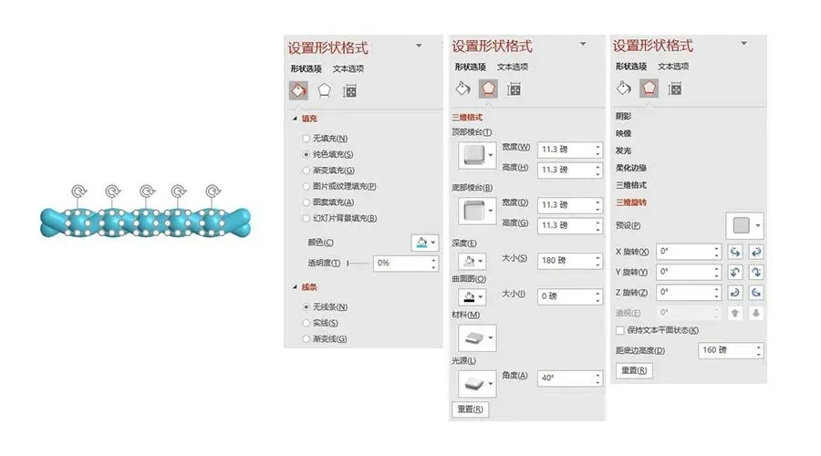 三维旋转参数保持 X、Y、Z 均为 0°,并将所有椭圆距底边的高度统一设为 160 磅。