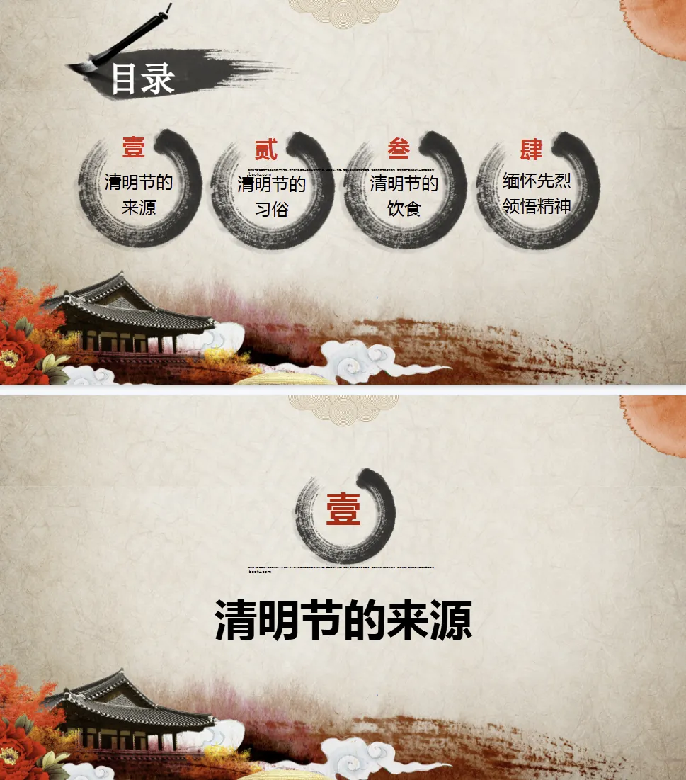 整体设计偏向简洁、克制,色彩与排版更符合清明节庄重的表达需求。同时,多数模板结构完整,包含开场、主体内容与总结部分,能够直接用于实际场景。